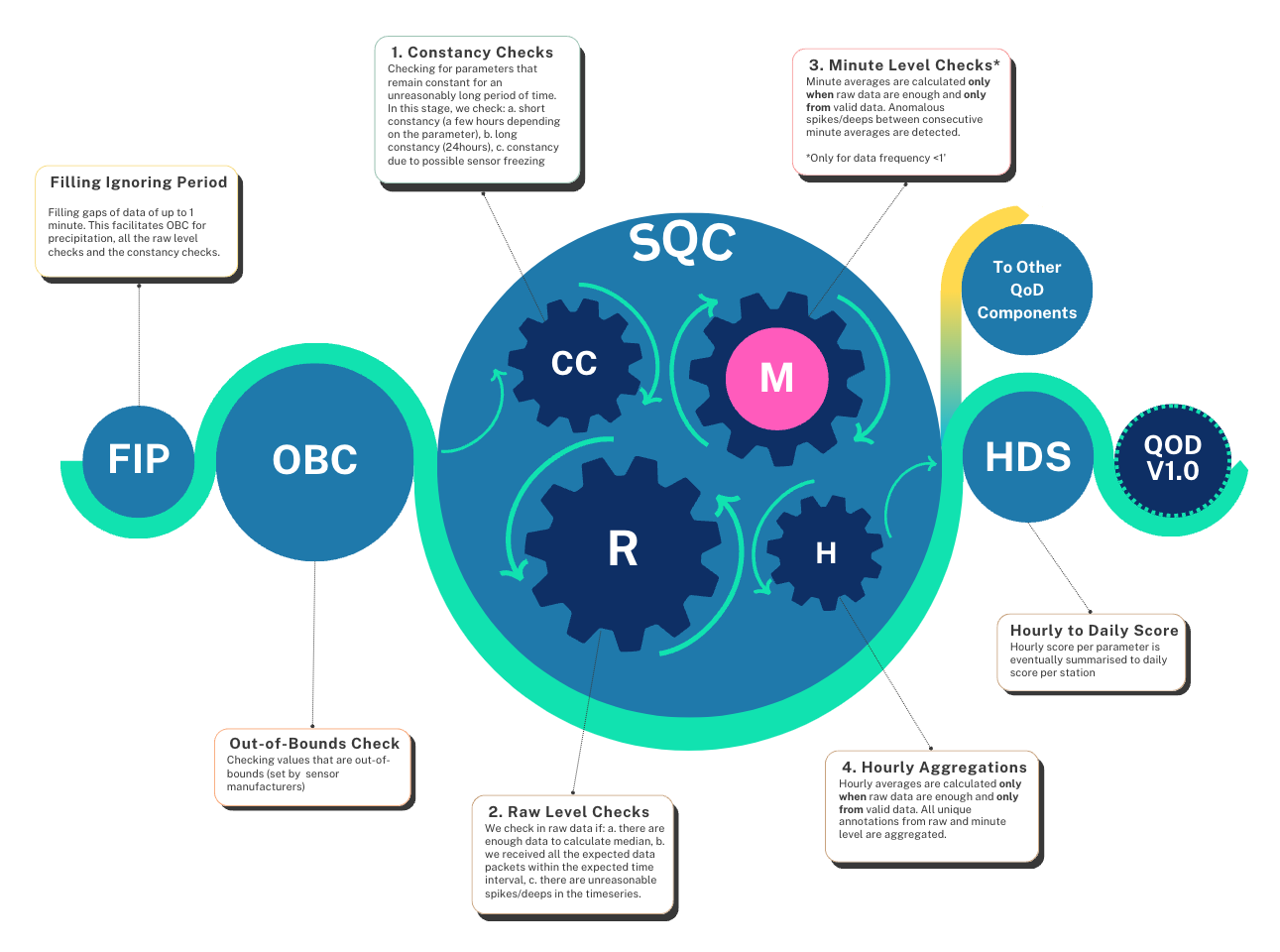 SQC is the process that identifies unexpected behaviour in the measured parameters, which could be attributed to a defective sensor or an improper station deployment. It should be noted that OBC is included in SQC as the first step of this process. The final result of this process is the annotation of the data in 3 levels: