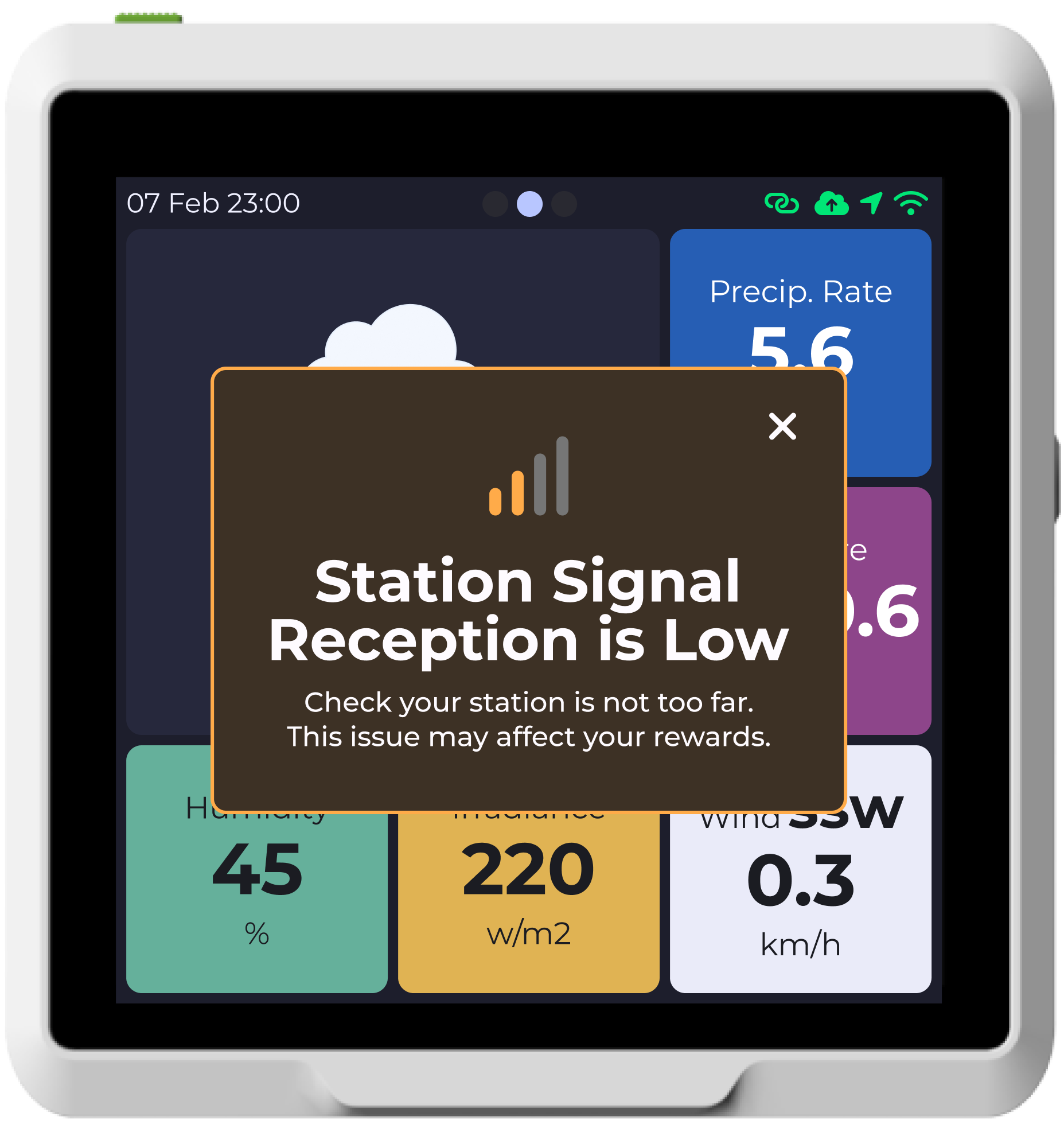 When the RF connection with the Weather Station is weak, the WG1200 Gateway will display "Station Signal is Low" resulting to Data Gaps and reduced Rewards.