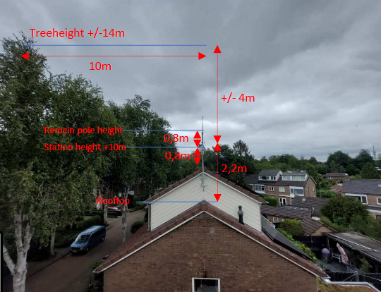 The station has been deployed at the highest point of this apartment, which is located at an area, where other obstacles are not much higher. Notice that the level of the outdoor sensor is very close to the level of the tree tops, and so wind/rain measurements shouldn’t be affected. It is also placed on a >2m mast and, hence, temperature/humidity is not affected by the roof’s material.