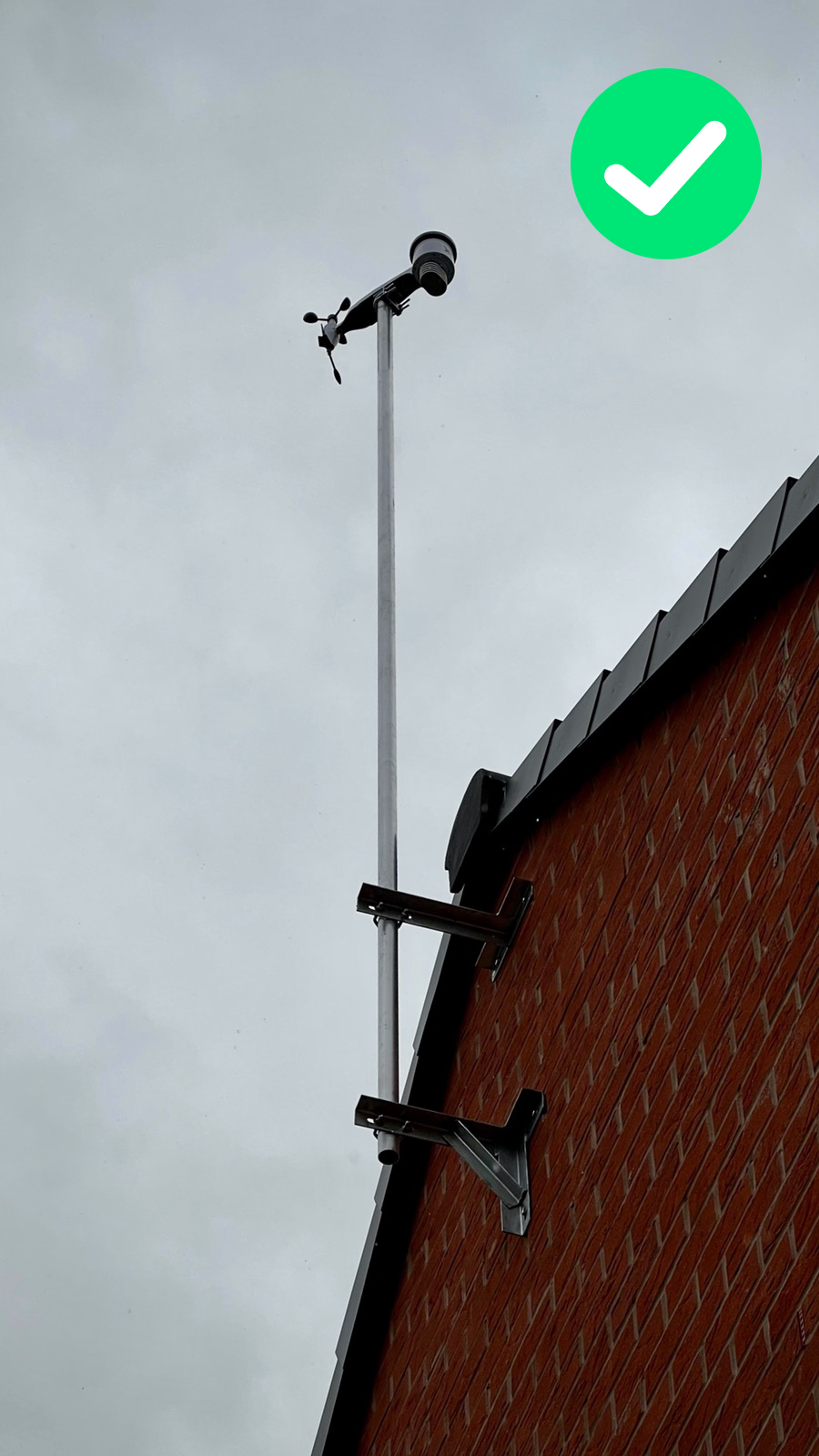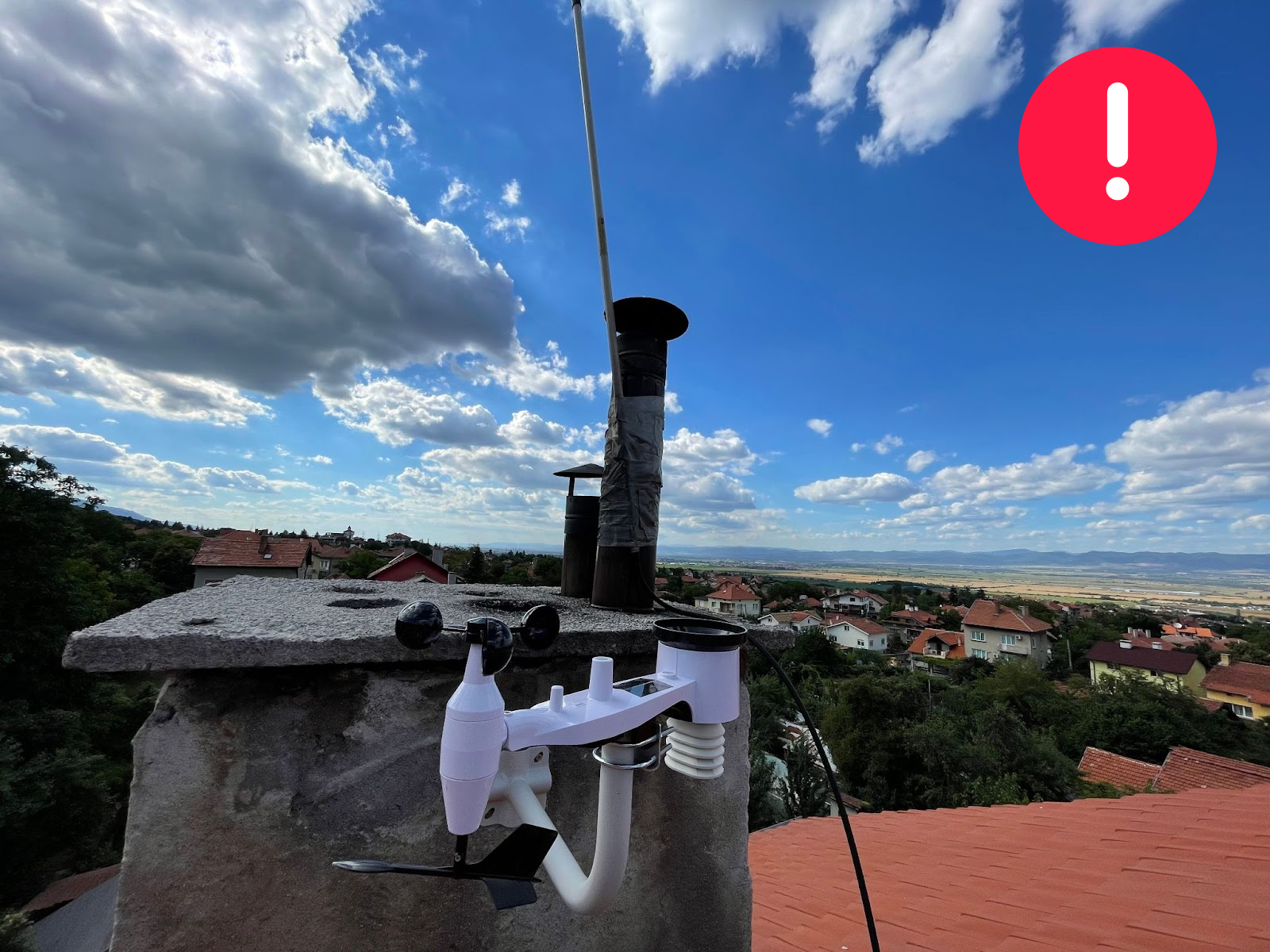 The station is deployed on an appropriate mast, but it is not at the highest possible point of the area (there is a higher building to the north and tall trees to the south). There is also a chimney below it.