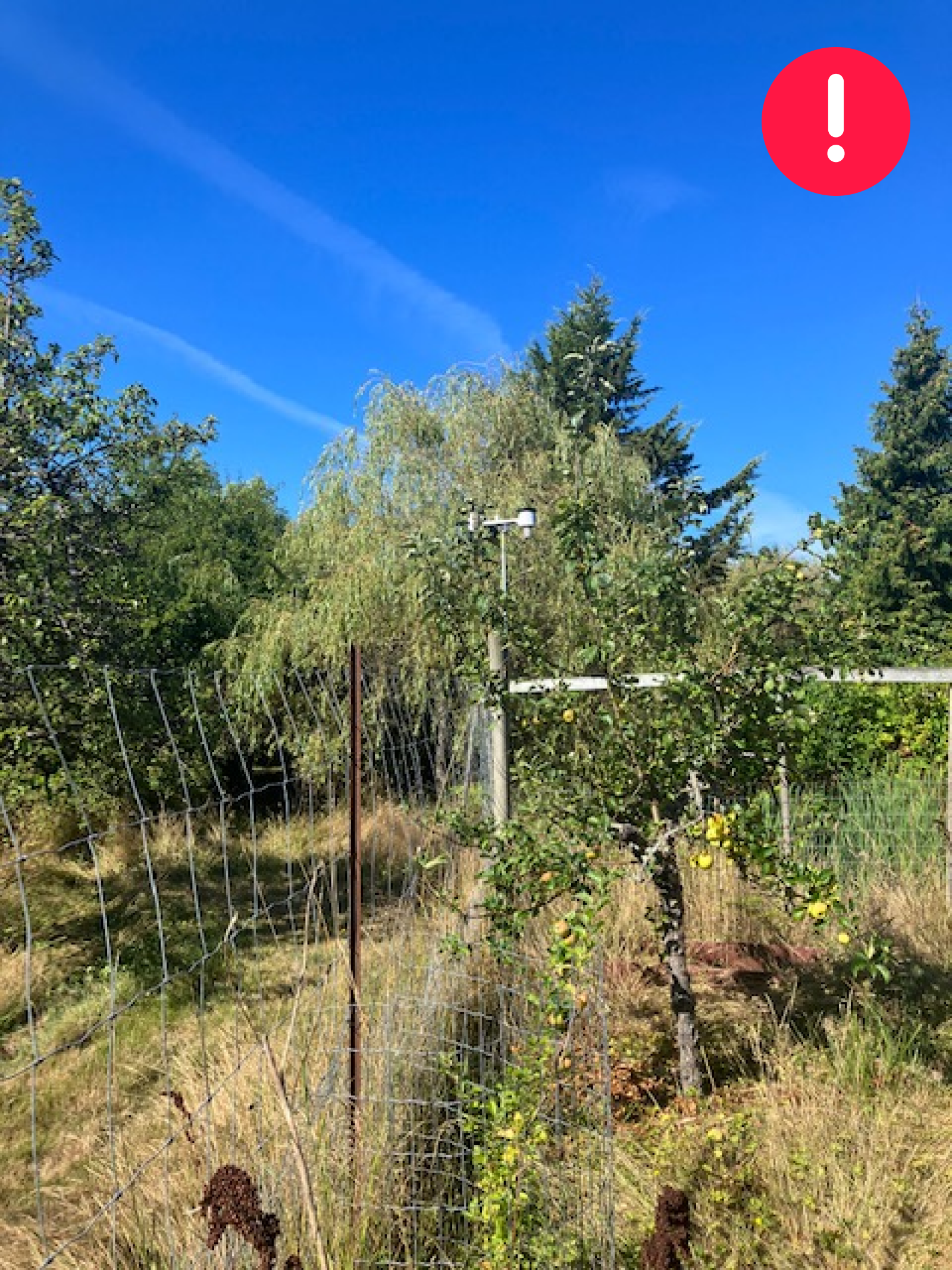 Tall trees will affect rain and wind measurements when wind blows from the west. According to WMO a wind gauge should be placed at a distance 10 times the higher obstacle height.