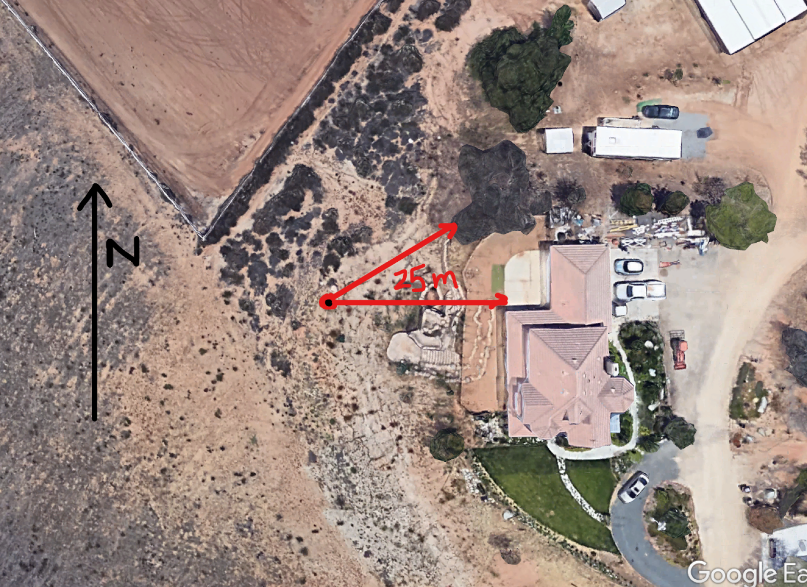 Photos showing from left to right the East - North - South - West horizon of the outdoor sensor. The last photo at the bottom shows Google Maps top view of the area together with distances from the surrounding obstacles
